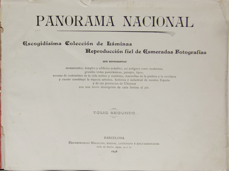 Panorama nacional : escogidísima colección de láminas reproducción fiel de esmeradas fotografías que representan monumentos, templos y edificios notables, así como antiguos como modernos, grandes vistas panorámicas, paisajes, tipos, escenas de costumbres de la vida militar y marítima ... de nuestra España y de sus provincias de ultramar con una breve descripción de cada lámina al pie. Barcelona : Hermenegildo Miralles, 1898