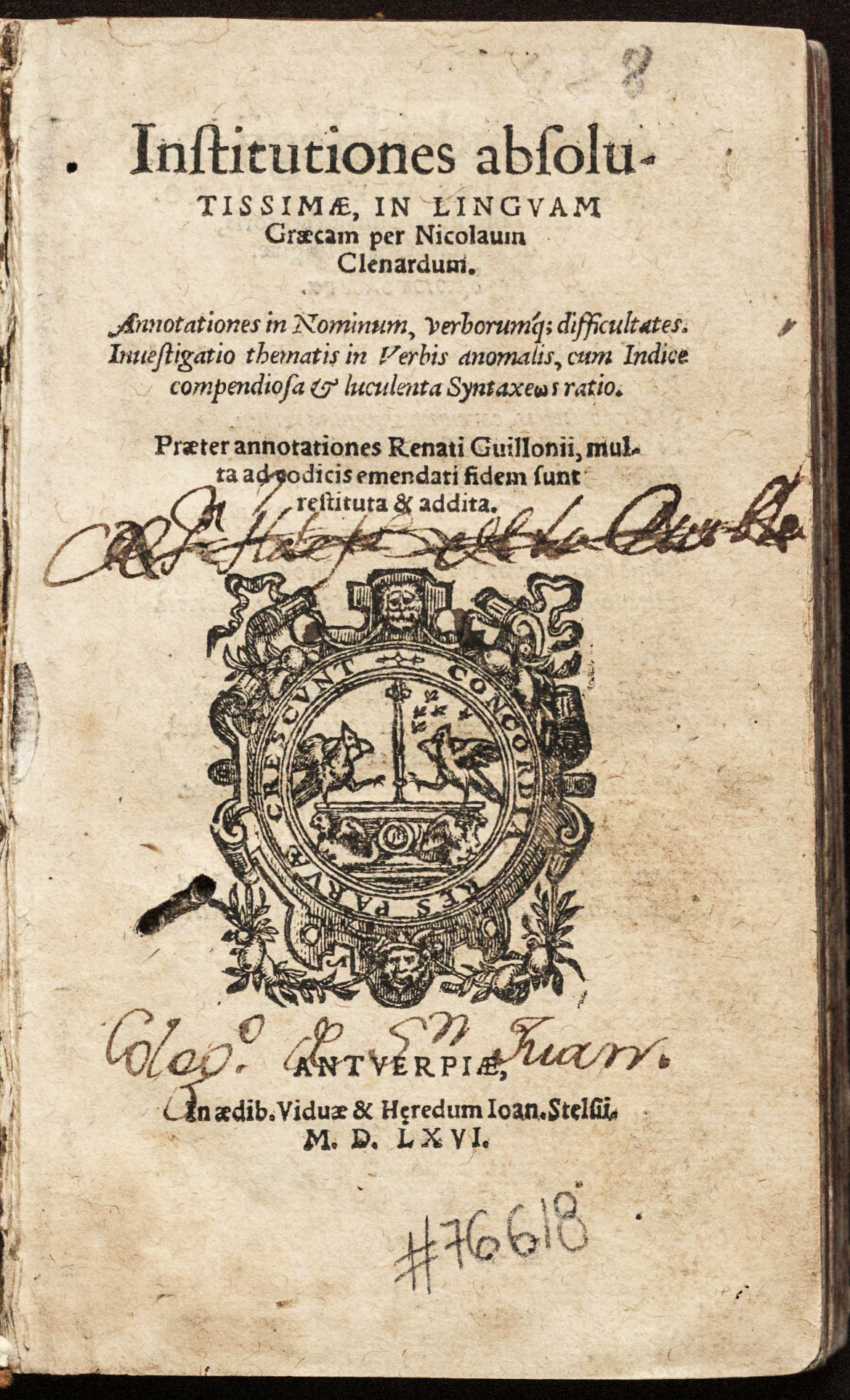 Institutiones absolutissimae, in Linguam Graecam / per Nicolaum Clenardum ... Praeter annotationes Renati Guillonii, multa ad codicis emendati fidem sunt restituta & addita