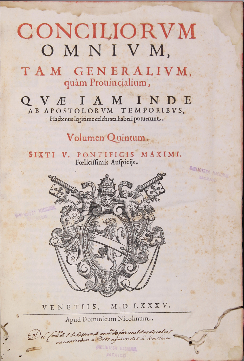 Iglesia Católica Concilios Conciliorvm omnivm, tam generalivm, quàm prouincialium, qvae iam inde ab apostolorvm temporibus, hactenus legitime celebrata heberi potuerunt : volumina quinque. Venetiis : Apud Dominicum Nicolium, 1585