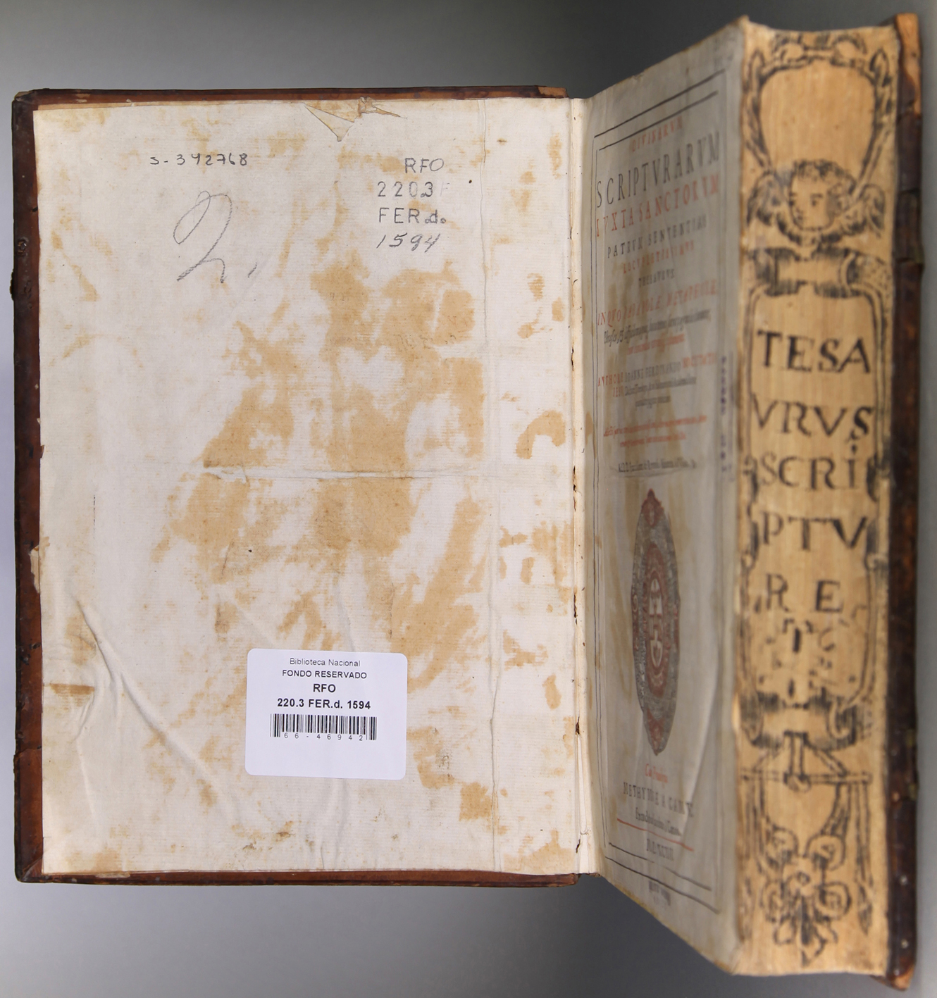 Lucas, Franciscus, 1549?-1619 Divinarvm Scriptvrarvm ivxta sanctorvm patrvm sententias locvpletissimvs thesavrvs : in qvo parabole, mataphorae, pphrases, et difficiliora quaeque loca totius sacrae paginae declarantur, cum concordia vtrisque testamenti / Methymnae a Campo : Excudebat Iacobus à Canto, 1594